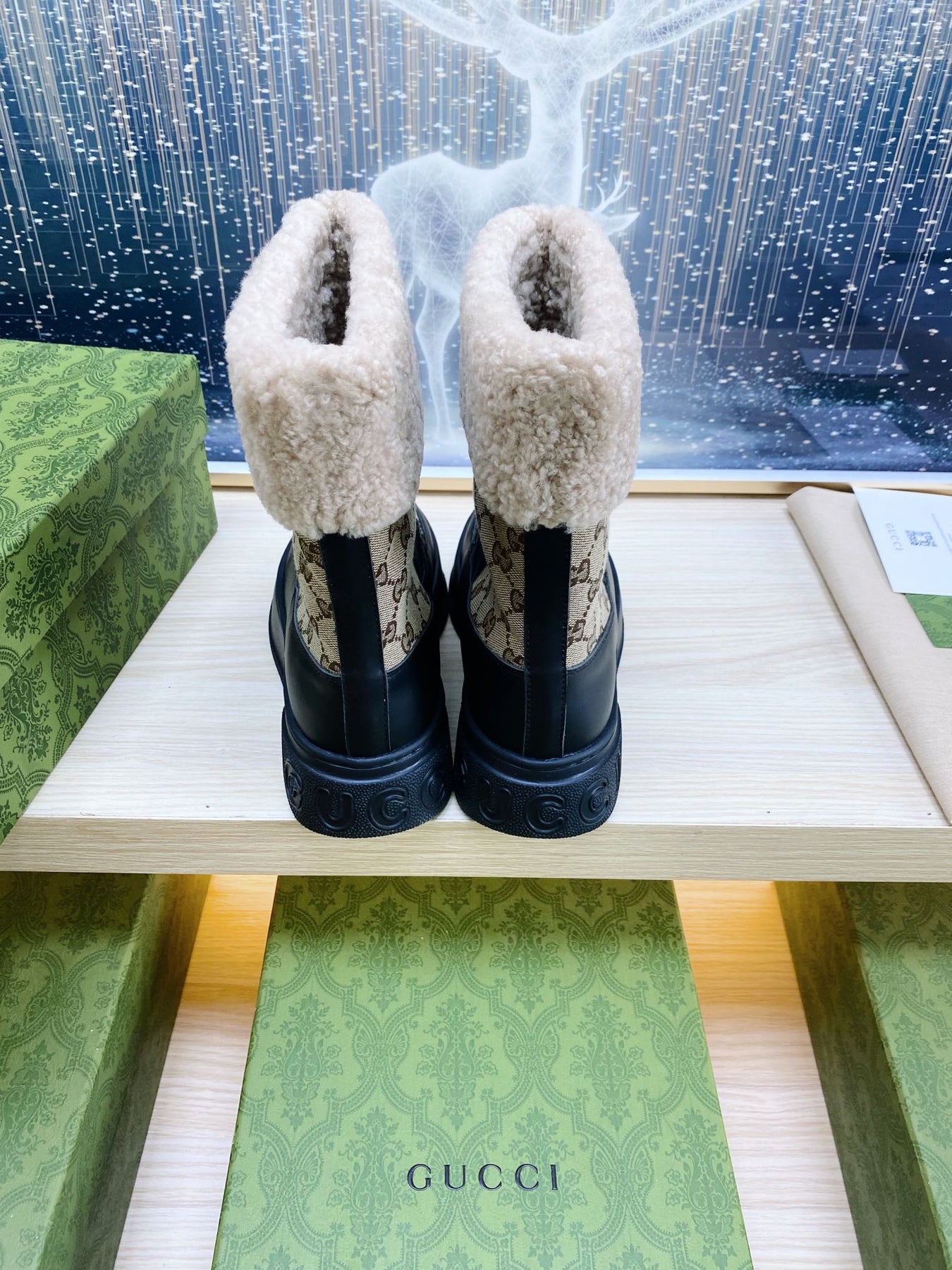 HORSEBIT ANKLE BOOTS WITH MERINO TRIM IN BEIGE JACQUARD FABRIC MIX BLACK CALFSKIN