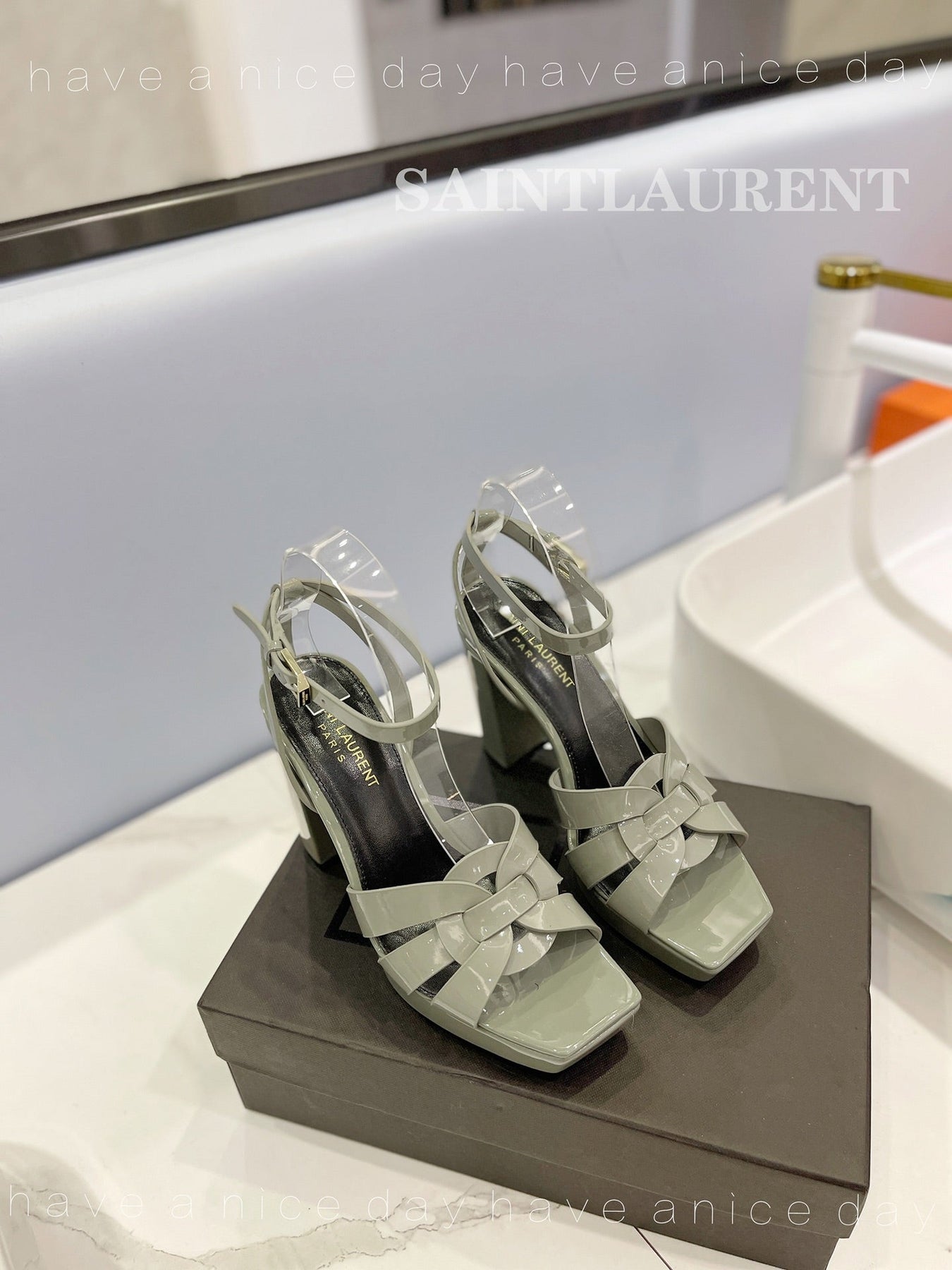 SL TRIBUTE FLATFORM SANDALS GLOSSY SAGE CALFSKIN